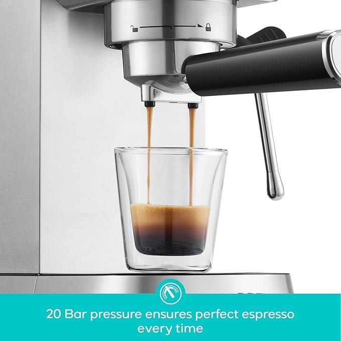 The frother is designed to heat milk quickly and evenly, creating a smooth texture and rich flavor that complements your espresso perfectly.The CASABREWS Espresso Machine 20 Bar is thoughtfully designed to fit smaller kitchens or office counters without compromising functionality. Its compact footprint ensures it doesn’t take up unnecessary space, while the detachable 34-oz (≈1 L) water tank allows multiple cups of coffee before a refill is needed. This makes it perfect for busy mornings, home offices, or small households where efficiency and convenience matter. Cleaning and maintenance are simple, thanks to removable components, including the drip tray, water tank, and portafilter, ensuring your machine stays hygienic and ready for use at all times.Ease of use is at the heart of this semi-automatic espresso machine. The package includes single and dual-cup filters, a portafilter, a tamper with spoon, and intuitive controls that make brewing simple yet precise. Whether you’re making a solo shot to start your day or serving multiple drinks to friends and family, this machine adapts seamlessly to your needs. Its user-friendly interface, combined with professional-grade performance, provides a perfect balance between convenience and café-quality results.The CASABREWS Espresso Machine 20 Bar is also engineered with durability in mind. Its stainless-steel body resists wear and tear, ensuring long-lasting performance and reliability. The robust construction of the pump and boiler means you can enjoy consistent, high-quality coffee for years to come.