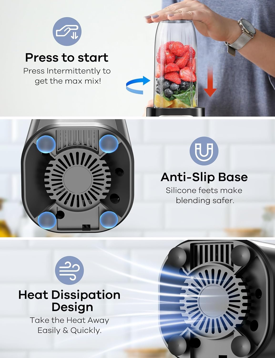 • Easy Cleanup: Both the cups and lids are dishwasher-safe, and the motor base features non-slip pads and a cooling fan for safety and convenience, embodying a modern easy clean blender design.