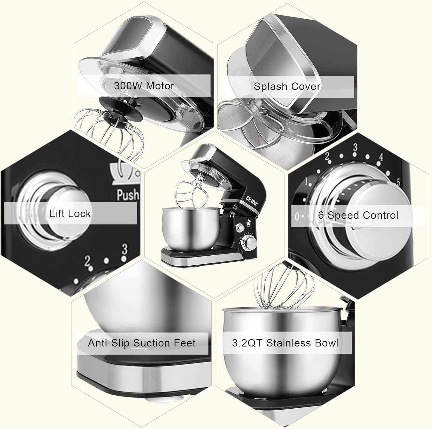 • Tilt-Head Convenience: The tilt head mixer design ensures quick access to the bowl, making attachment swaps and cleaning faster and easier than ever. The 3.2qt mixer bowl is stainless steel and comes with a splash guard for a tidy workspace.