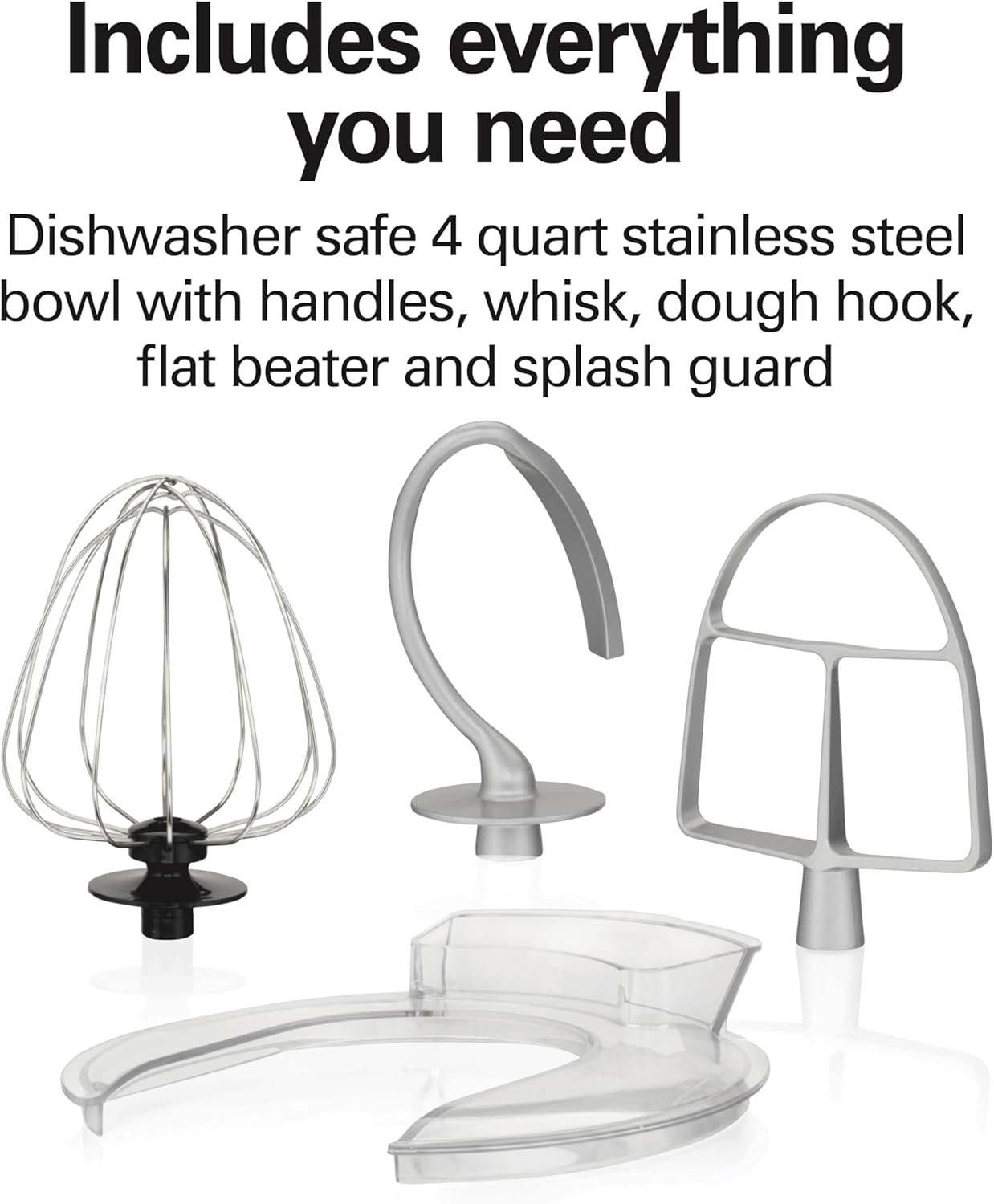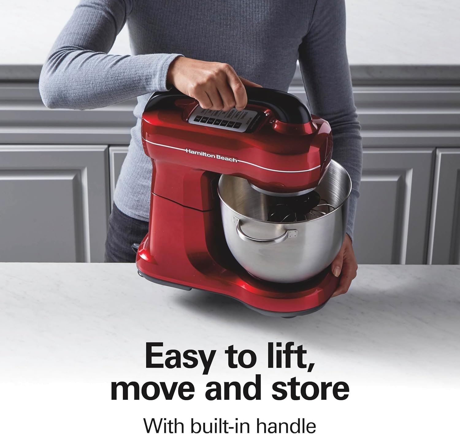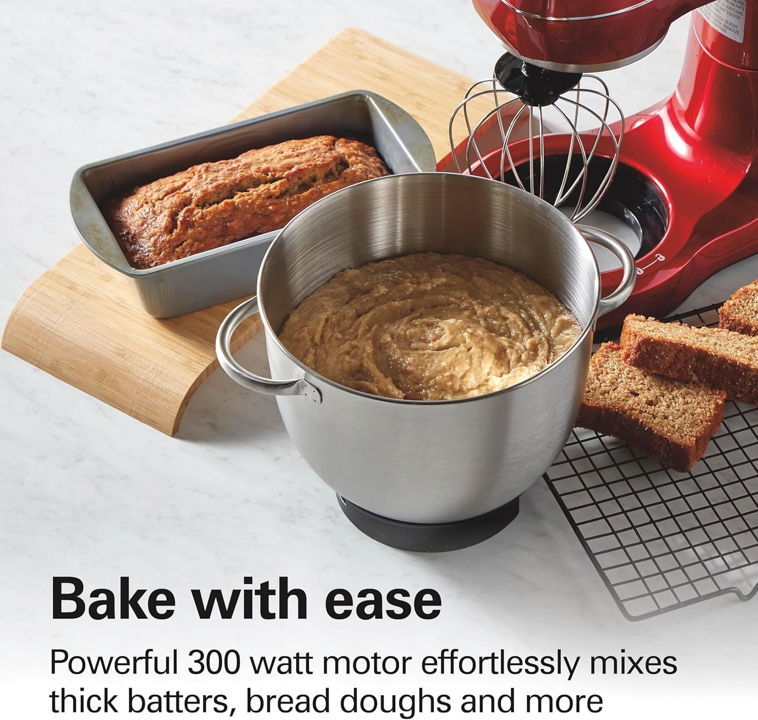 The Hamilton Beach Electric Stand Mixer is designed to make baking at home effortless and enjoyable. With a powerful 300-watt motor, seven speed settings—including a slow-start option—and planetary mixing action, it handles everything from bread dough to delicate batters with ease. This 4-quart mixer includes essential attachments like a dough hook, flat beater, whisk, and splash guard, all of which are dishwasher safe for easy cleanup. Featuring a convenient built-in handle for lifting and storage, it's a versatile and user-friendly choice for both novice and experienced bakers.